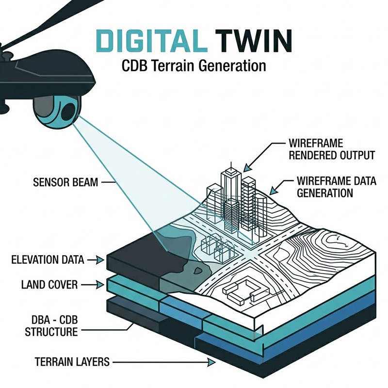 在 2026 年的高階無人航空載具(UAV)系統工程中,虛擬訓練與感測器演算法驗證已全面邁入「數位雙生(Digital Twin)」時代,現代戰術無人機高度仰賴多光譜光電/紅外線(EO/IR)與合成孔徑雷達(SAR)進行自主導航、地形地貌匹配(TERCOM)及目標辨識,傳統的模擬訓練器僅需滿足人類肉眼的「艙外視覺(Out-The-Window, OTW)」需求,提供幾何外觀與貼圖即可;然而,當受測對象轉變為機器視覺與 AI 演算法時,系統必須提供具備嚴格物理學與熱力學意義的數位環境,為此業界已廣泛採用開放地理空間協會(OGC)制定的通用資料庫(Common Database, CDB)格式,CDB 採用無預先編譯(Pre-compilation)的動態即時存取架構,這雖然帶來了極大的資料標準化優勢,但也對底層的影像產生器(Image Generator, IG)與多邊形渲染管線帶來了極為嚴苛的運算挑戰。