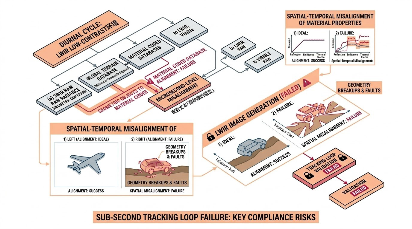 在真實環境的晝夜交替(Diurnal Cycle)中,不同材質的熱容量(Thermal Capacity)差異會導致極端的現象,例如在黃昏或黎明時,金屬載具的表面溫度可能與周圍土壤完全相同,造成在 LWIR 頻段下的「熱交叉(目標隱形)」效應,測試規範要求必須驗證感測器在這種極端低對比環境下的自動增益控制(AGC)穩定性。實務上,測試平台極難將全球地形資料庫中數以百萬計的幾何物件,無縫對齊至精確的材質編碼資料庫(Material Coded Databases),一旦材質屬性(如反射率、發射率與熱慣性)的指派出現微秒級的錯位,將導致熱成像畫面出現幾何斷層,徹底破壞追蹤迴路(Tracking Loop)的閉環測試。