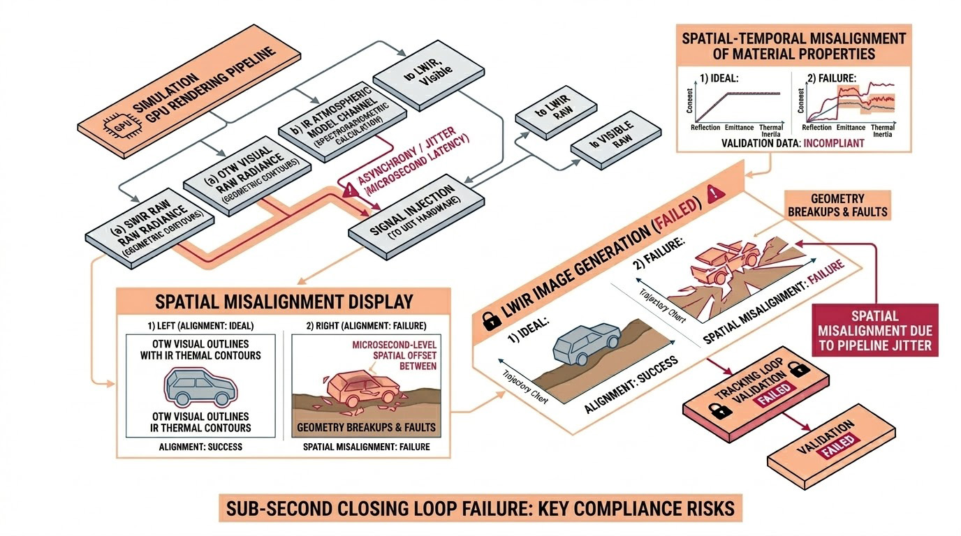 無人機的夜視與紅外線感測器必須在濃霧、雨雪或沙塵等惡劣大氣中運作,測試時必須動態計算 3D 大氣模型對特定紅外線波長的散射與吸收率,更嚴峻的挑戰在於,測試系統必須將這套複雜的大氣衰減運算,與一般可見光(Out-The-Window, OTW)視覺通道保持零幀數掉幀(Jitter-free)的絕對同步,只要運算管線(Rendering Pipeline)發生微小的非同步,紅外線偵測到的熱點幾何座標,將與可見光通道的物理輪廓產生空間偏移(Spatial Misalignment),使得多光譜融合演算法的驗證數據直接報廢。
