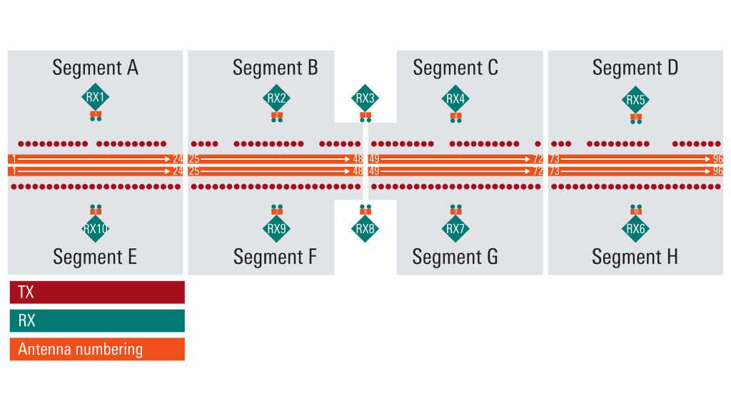 R&S®QAT-B11 標準前端配備 96 個發射天線和 5 個接收天線,分為 4 個獨立區段,此配置滿足了 SIMO 感測器要求,R&S®QAT100 可依需求以線路模式或分段模式運作,分段模式將每條線路分為四個段,每個段配備獨立的射頻連接器,可模擬來自不同方向的最多四個目標;R&S®QAT-B11 可配備額外的 TX/RX 線路 (R&S®QAT-B2),以增加另外 96 根發射天線和 5 根接收天線,從而模擬來自不同方向的最多 8 個目標或整個陣列中的兩個物體。