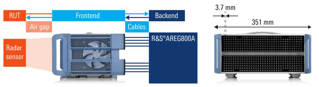 定義從感測器到 R&S®QAT100 的物理距離,各個天線間距為 3.7 公釐(0.146 吋),單元總寬度為 351 公釐(13.818 吋),此設定可根據感測器進行客製化,R&S®QAT100 專為典型的 ADAS 雷達發射功率而設計。
