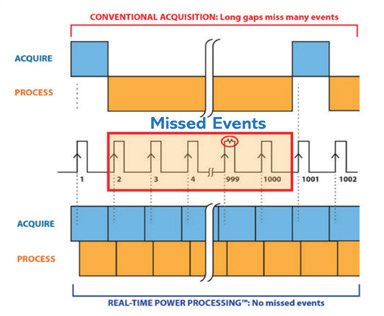 傳統的訊號處理方法,其運作模式是在波形上擷取足夠的樣本 (sample) 以重現軌跡 (trace),然而在將樣本轉換為軌跡的過程中,擷取作業會完全停止,並以循序方式處理資料;這個處理延遲所造成的「量測死區時間」,代表任何在此期間發生的訊號事件都將被遺漏;總體而言,標準的功率計與 USB 感測器在觸發掃描 (triggered sweeps) 之間普遍存在長時間的量測間隔,這使其幾乎無法捕捉到關鍵的間歇性訊號現象(如圖 1 所示),例如:來自外部的短暫干擾或調變錯誤,此外,高頻率的資料擷取會快速消耗感測器有限的記憶體容量,極易引發緩衝區溢位 (buffer overflow),這種硬體限制往往將有效觀測視窗壓縮在少於 1 秒,對於需要數秒才能顯現熱效應或穩定性問題的 Wi-Fi 裝置特性分析而言,這樣的量測時間遠遠不足。