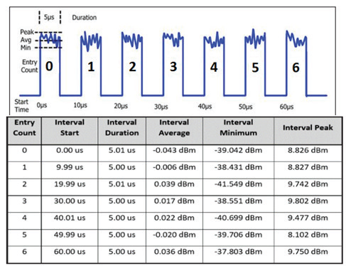 RTP 量測緩衝模式應用程式是一套便利的軟體工具,其核心價值在於釋放 RTP4000 與 RTP5000 系列即時功率感測器內建的 RTPP 技術潛能,提供了一種由原廠支援的整合方案,讓工程師無需自行開發複雜的程式,即可執行極長時間的功率量測;該軟體能夠控制單一或多個感測器,以每秒高達 100,000 次的驚人速度進行量測,並且僅在使用 者自訂的關注時間區間內分析輸入訊號,這讓分析得以聚焦於 Wi-Fi 封包本身,而忽略封包之間的無用資訊;對於每個脈衝、叢發 (burst) 或關鍵事件,系統會近乎即時地回傳一筆結構化的獨立資料記錄,其中包含峰值功率、平均功率、最小功率,以及精確的開始時間與量測持續時間(如圖 2 所示),大幅提升了分析效率。