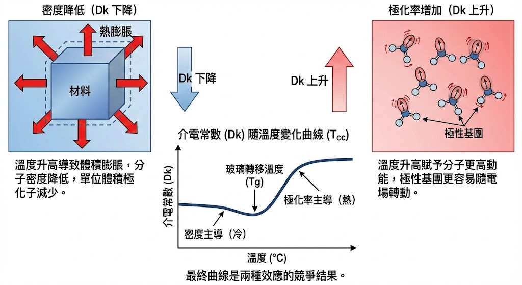 溫度的升高賦予分子更高的動能,使得某些極性基團更容易隨電場轉動(極化能力增強),這會導致 Dk 值上升。