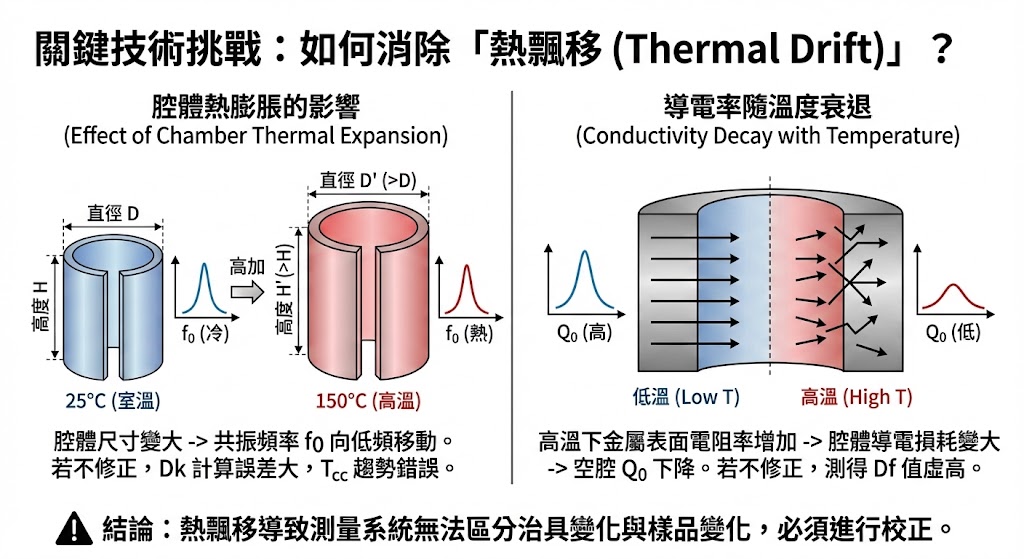 SCR 治具通常由銅或鋁合金製成,金屬具有熱膨脹特性,當溫度從 25°C 升高到 150°C 時,腔體的直徑與高度會微幅增加,根據微波共振原理,腔體尺寸變大,其本身的共振頻率 f0 就會向低頻移動,如果量測系統無法區分「因腔體膨脹導致的頻率下降」與「因樣品 Dk 變化導致的頻率下降」,最終計算出的 Dk 值將包含巨大誤差,甚至出現錯誤的 Tcc 趨勢(例如將原本 Dk 隨溫度穩定的材料誤判為 Dk 隨溫度升高)。
