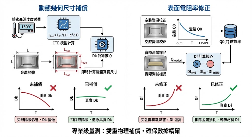 系統軟體中內建了治具金屬材料的熱膨脹係數 (CTE) 模型,在每一個溫度測試點(例如每隔 10°C),軟體會讀取精密溫度感測器的數值,並利用 CTE 公式即時計算出當下溫度的腔體「真實尺寸」,Lhot = L23 × (1 + α · ΔT) 在計算 Dk 時,演算法會使用這個修正後的尺寸參數,從而完全扣除治具熱膨脹帶來的頻率漂移,只保留材料本身造成的變化。