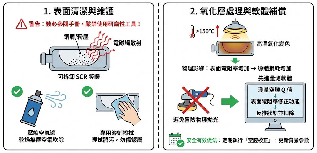 - 軟體補償:先進的量測軟體具備 「表面電阻率修正 (Surface Resistance Correction)」 功能,透過測量空腔的 Q 值,軟體可以反推當前的表面狀態並在計算 Df 時予以扣除,因此,與其冒險物理拋光,不如定期執行「空腔校正」,更新軟體中的背景參數更為安全有效。