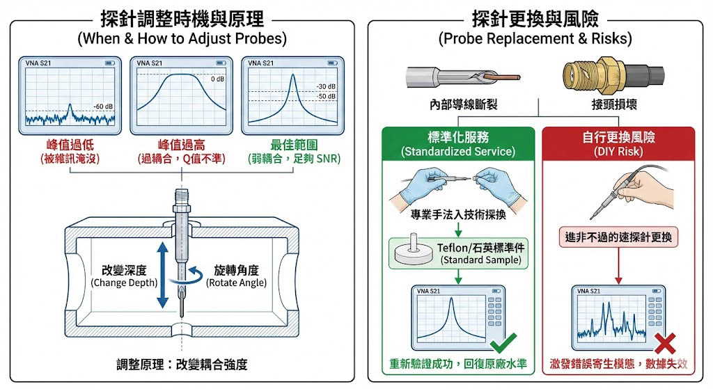 當您發現 VNA 上的共振波形 (S21) 峰值過低(例如低於 -60 dB),導致訊號被雜訊淹沒;或者是峰值過高(接近 0 dB),導致「過耦合 (Over-coupling)」使得 Q 值測量不準時,就需要調整探針。