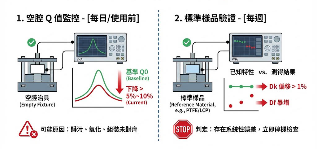 準備一片已知特性且穩定的標準樣品(如 NIST 認證的標準片,或高品質的 PTFE/LCP),定期量測:每週量測一次該樣品,若測得的 Dk 偏移超過 1% 或 Df 暴增,代表治具或 VNA 系統存在系統性誤差,需立即停機檢查。