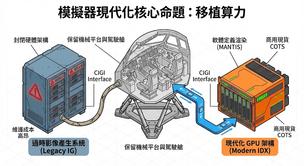 在航空訓練產業中,存在著一個價值數十億美元的難題:許多於 90 年代或 2000 年代初期投入使用的全光飛行模擬器(Full Flight Simulator, FFS),其機械運動平台(Motion Platform)與駕駛艙儀表仍然運作良好,但負責產生視覺畫面的「影像產生系統(Image Generator, IG)」卻已嚴重過時。