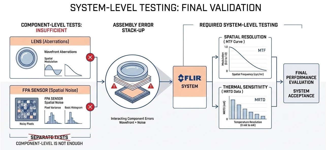 在紅外線光電系統的開發流程中,單獨測試焦平面陣列(FPA)或光學鏡頭是不夠的,當感測器與鏡頭組裝為完整的前視紅外線(FLIR)系統後,兩者的誤差(如透鏡的波前像差與感測器的空間雜訊)會相互疊加,因此工程師必須執行「系統級總體檢」,評估其最終的空間解析度(調變轉換函數,MTF)與熱靈敏度(最小可解析溫差,MRTD)。