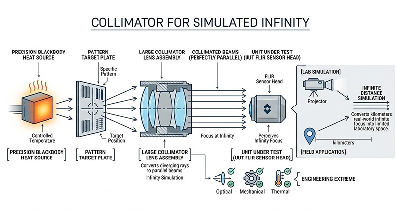 在真實應用中,FLIR 觀測的目標通常位於數公里外的無窮遠處,為了在有限空間的實驗室內重建這個物理條件,測試架構必須依賴「紅外線目標投影器(IR Target Projector)」,其基本原理是:利用一個精確控溫的黑體輻射源,背光照射具有特定空間頻率圖案的鏤空金屬目標板,接著讓這帶有圖案的紅外線輻射穿過一組大型準直儀;準直儀的作用是將發散的光波轉換為絕對平行的光束,使待測物(UUT)在光學上「認為」該目標位於無窮遠處;然而要讓這套包含光、機、熱三種物理型態的系統完美協同運作,工程上面臨著嚴苛的極限挑戰。