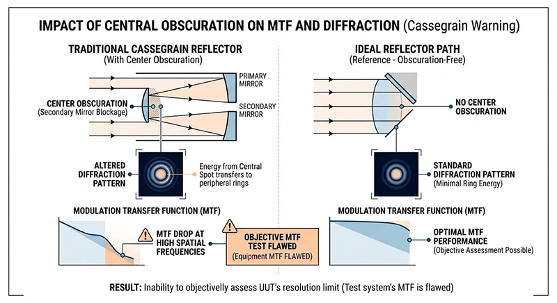 在處理涵蓋中波(MWIR)至長波紅外線(LWIR)的寬頻輻射時,傳統的折射式透鏡(如鍺或矽鏡片)會產生嚴重的色差(Chromatic Aberration),且材料吸收率會隨波長改變,導致輻射能量衰減,為了實現全波段的無色差傳輸,系統必須採用反射式光學設計;然而,若採用傳統的卡塞格林(Cassegrain)同軸反射鏡,其副反射鏡會阻擋光束的中心區域,產生「中心遮蔽效應(Central Obscuration)」;在光學物理上,中心遮蔽會改變系統的繞射圖樣(將能量從中心亮斑轉移至外圍的繞射環),直接導致高空間頻率下的 MTF 下降,若測試設備自身的 MTF 存在衰減,工程師將無法客觀評估待測物真實的解析度極限。