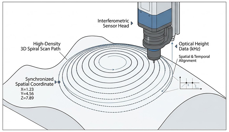 此外,為了完整重建自由曲面的拓撲,量測系統不再只是進行單純的二維輪廓掃描,而是需要執行高密度的三維螺旋掃描或網格掃描,在這種高動態連續掃描過程中,感測器(如白光干涉儀或多波長共焦感測器)必須以高達數萬赫茲的頻率進行資料擷取,規範嚴格要求,每一筆光學高度數據都必須與當時真實的三維空間機械座標達成「絕對的一致性」,這種對「空間幾何純度」與「時空同步精度」的雙重極限要求,直接宣判了傳統基於單軸線性滑台或低階旋轉分度盤的量測架構的死刑。