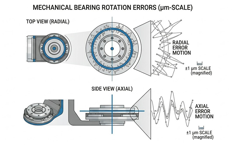當機械軸承旋轉時,滾動體的不完美圓度、珠槽的加工公差以及潤滑油膜的厚度波動,都會導致旋轉中心在三維空間中產生微小的隨機漂移,這些漂移被定義為「徑向誤差運動(Radial Error Motion)」與「軸向誤差運動(Axial Error Motion)」,在傳統高階機械轉台中,這些誤差通常在幾微米(Micrometers)的級別;對於要求零點五奈米量測精度的系統而言,幾微米的機械晃動就像是一場毀滅性的地震,會直接疊加到感測器讀取的光學高度數據中,使得工程師完全無法分辨量測到的起伏究竟是鏡片本身的真實面型,還是旋轉台的機械雜訊。