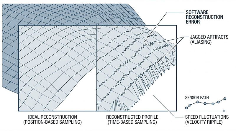 在傳統架構中,資料的擷取通常是「基於時間(Time-based)」的,也就是控制器以一個固定的時脈(例如 10 kHz)去觸發感測器拍照或讀值,然而在真實的物理世界中,量測平台的移動速度絕對不可能保持百分之百的恆定,當機台在自由曲面的轉角處減速,或因為機械阻力產生微小的速度波動(Velocity Ripple)時,如果感測器依然按照固定的時間頻率去取樣,就會導致資料點在空間中的分佈變得疏密不均。