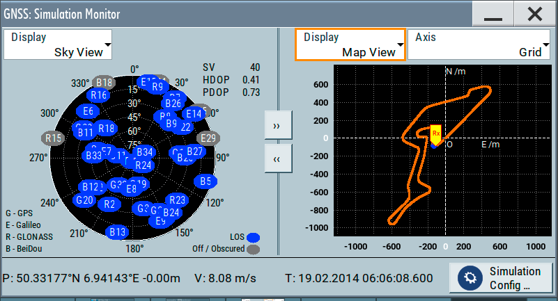 高階 GNSS 模擬器介面,能夠同時視覺化多個星系(GPS/Galileo/GLONASS/BeiDou)的衛星分布(Sky View)與動態使用者的地面軌跡。