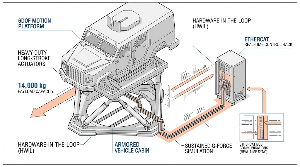 高階的重型載具模擬,從來不是單機運作,它必定是一個整合了車輛動力學模型(Vehicle Dynamics Model)、大氣干擾模型、視覺渲染引擎以及硬體迴路(Hardware-in-the-Loop, HIL)的複雜生態系,在這種封閉控制迴路中,虛擬兵推電腦以每秒上千次的頻率計算出載具的空間座標,並下達給 6DOF 平台。
