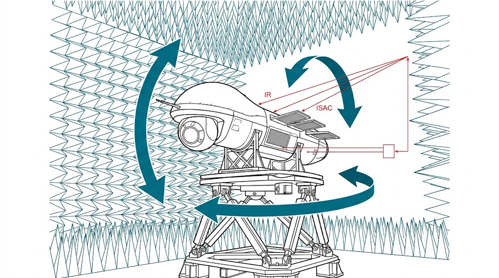 在先進防禦與無人載具(UAV)架構中,單一功能的雷達已不敷使用,現代軍工設計傾向將高解析度紅外線(IR)尋標器與「通訊感知一體化(ISAC)」主動相位陣列天線,高度整合在同一個極度緊湊的感測莢艙中,為了在實驗室內驗證這些造價高昂的感測器能否在極音速飛行、劇烈翻滾的狀態下,依然精準鎖定數百公里外的目標,工程師必須仰賴多軸「硬體迴路(HWIL)」動態模擬測試平台。