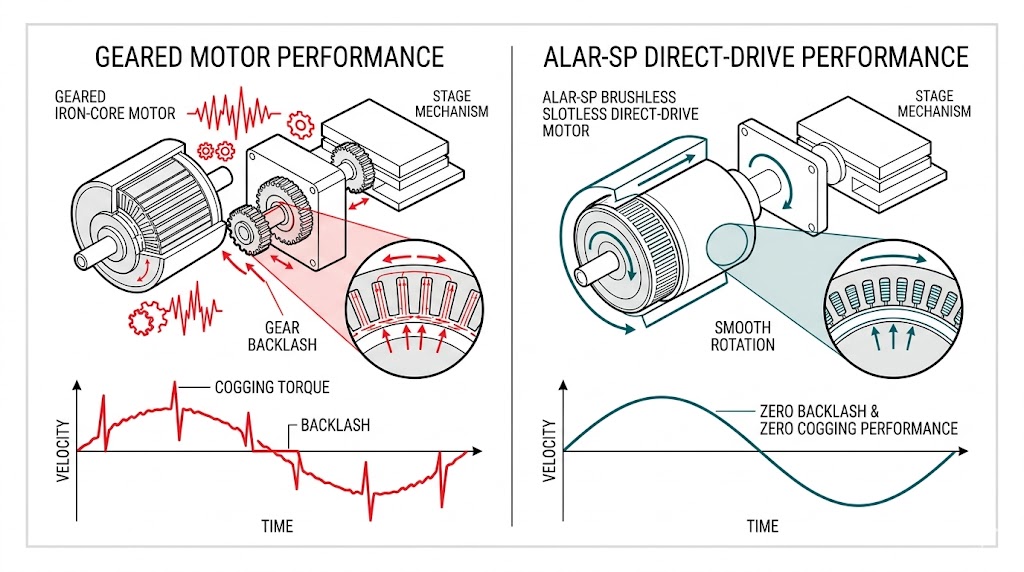 此圖對比齒輪馬達與直驅馬達。左側受齒輪背隙與頓轉轉矩影響,速度波動大;右側ALAR-SP直驅馬達實現零背隙、零頓轉性能,展現極致平滑度。