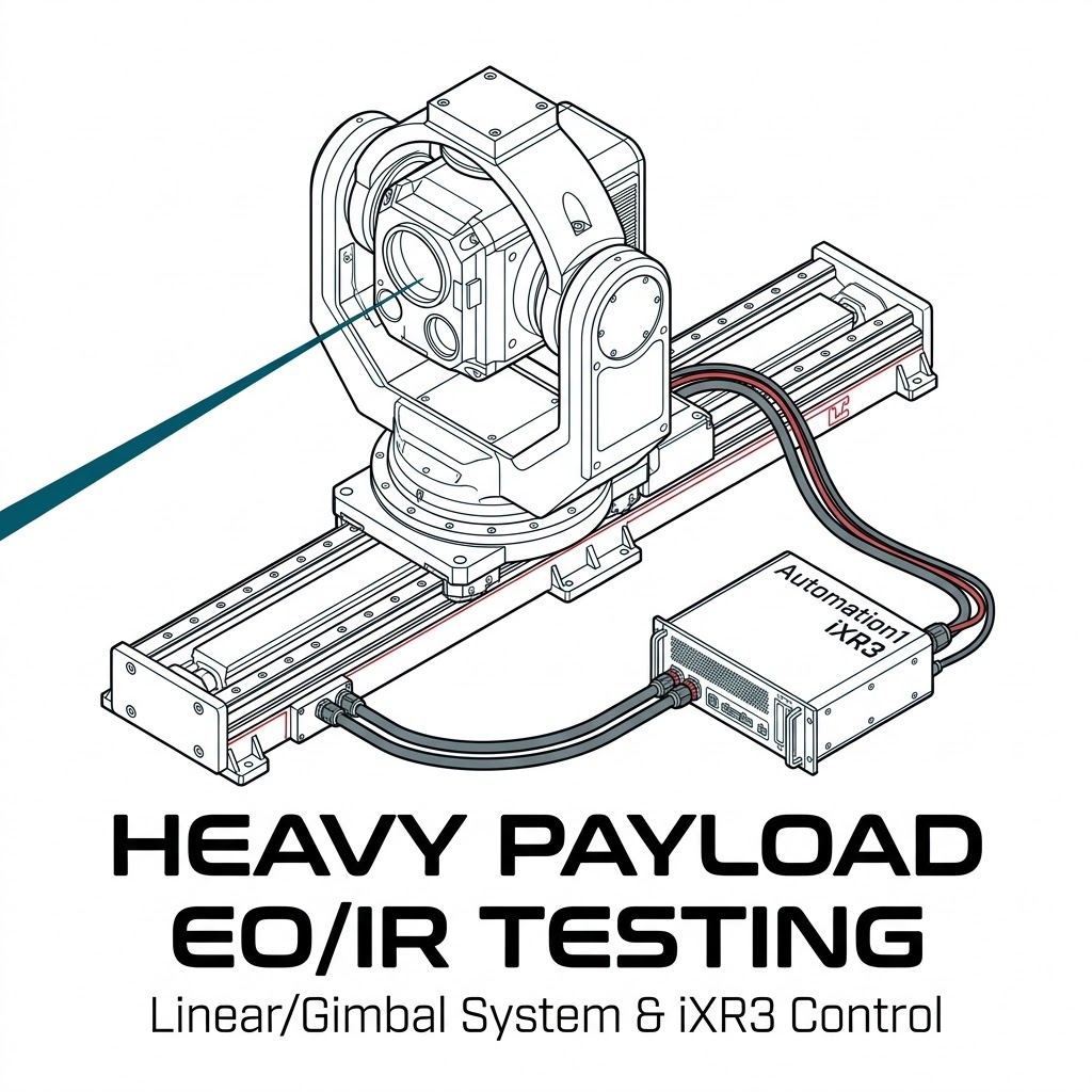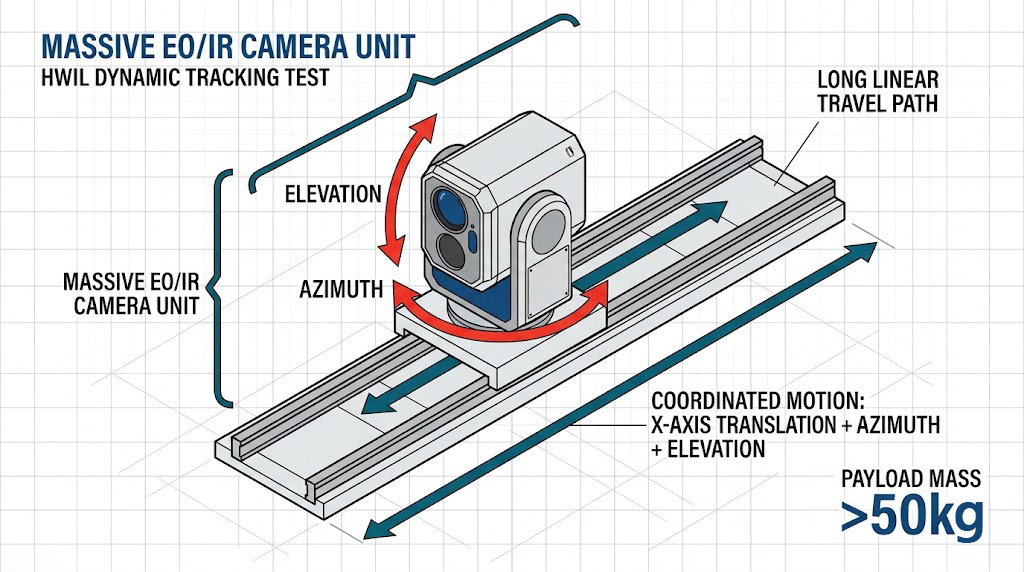 展示 >50kg 大型 EO/IR 攝影機單元,於 HWIL 測試中沿長距離路徑,進行包含 X 軸平移與仰角、方位角的協調多軸動態追蹤。