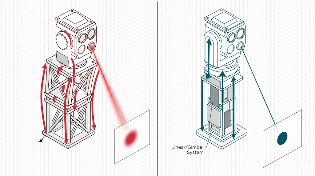 光電萬向雲台指向穩定性對比:左側(紅色)桁架平台重載偏擺大,指向模糊;右側(藍色)系統剛性高,指向精密清晰。