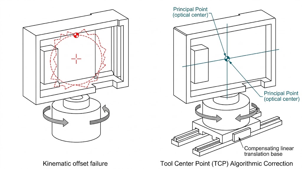 然而在傳統的多軸機構中,旋轉軸的物理中心是固定的,重型感測器的光心距離馬達旋轉軸心通常有數十公分的偏置距離(Offset),當雲台轉動一個角度時感測器的光心會在空間中畫出一個巨大的弧線,瞬間脫離原本對準的測試靶標,這種現象稱為「寄生位移」。