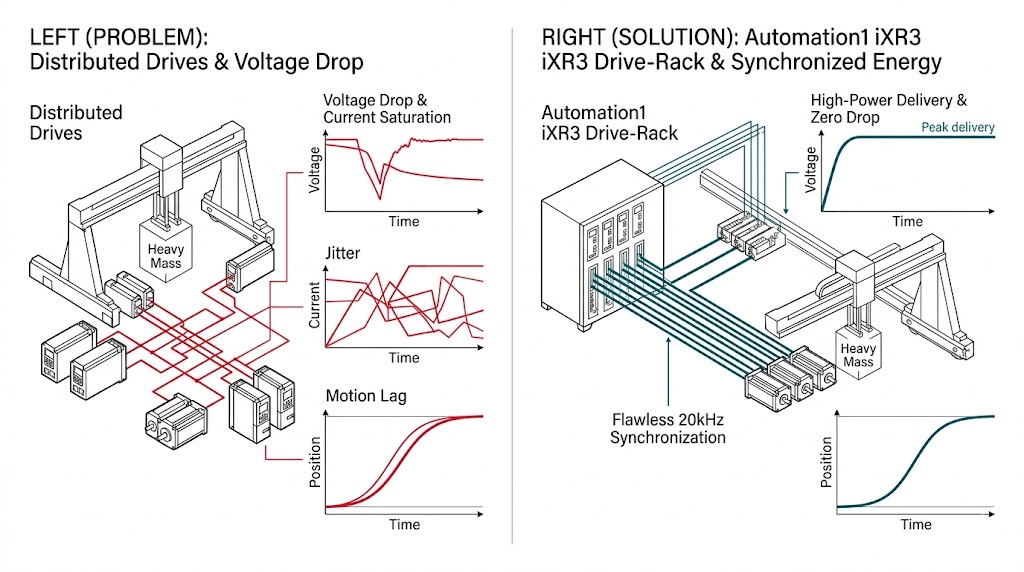 針對重負載,分散式驅動器(左)導致電壓降和運動滯後,Automation1 iXR3 整合式機架(右)則通過高功率和 20kHz 完美同步,實現精確運動。