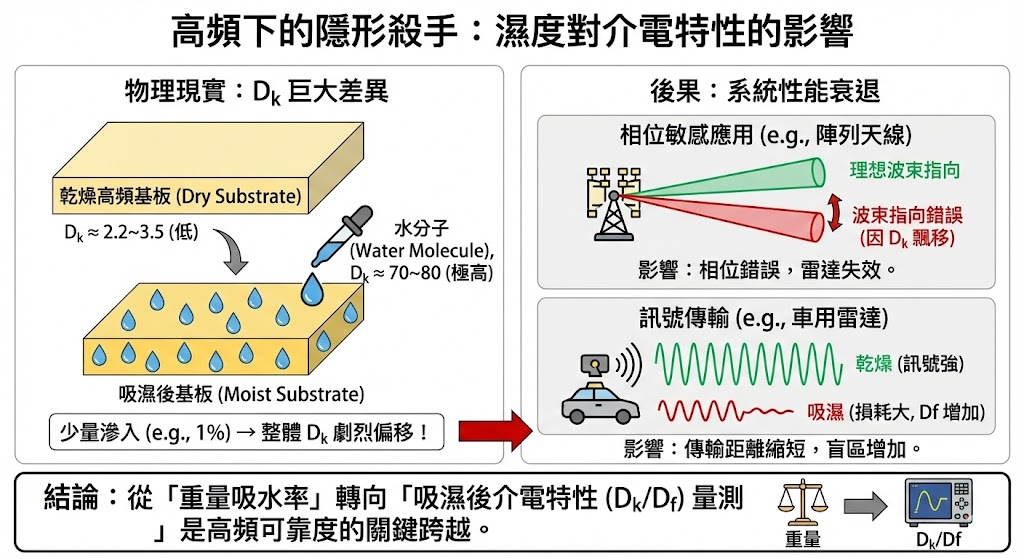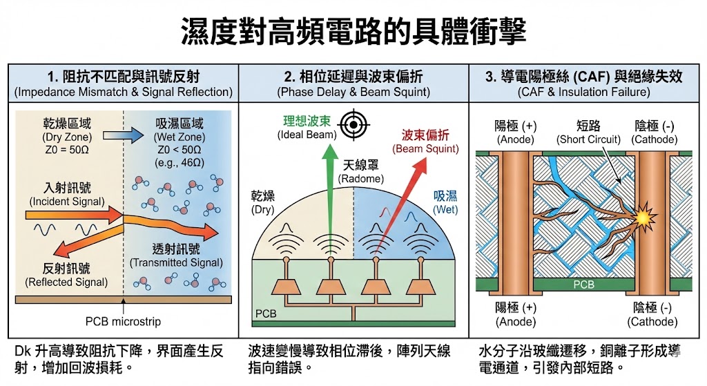 水的介電常數 (Dk) 在常溫下約為 70 至 80,而一般高頻基板 (如 PTFE、LCP、碳氫樹脂) 的 Dk 僅約 2.2 至 3.5,這意味著哪怕材料內部僅滲入 1% 的水分,根據混合介質理論,整體的有效介電常數就會發生劇烈偏移。 - 後果: