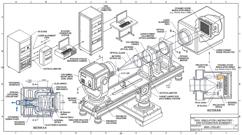 硬體迴路 (HWIL) 模擬實驗室架構示意圖:斯特林冷卻參考相機(作為 CRS)與大格式動態紅外景物模擬器精準對齊。