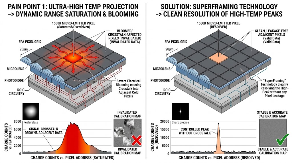 示意圖中呈現FPA偵測極高溫導致動態範圍飽和、電性溢散與串擾,校正失效(左);「SuperFraming」技術則能乾淨解析高溫峰值,無洩漏,確保校正精確穩定(右)。