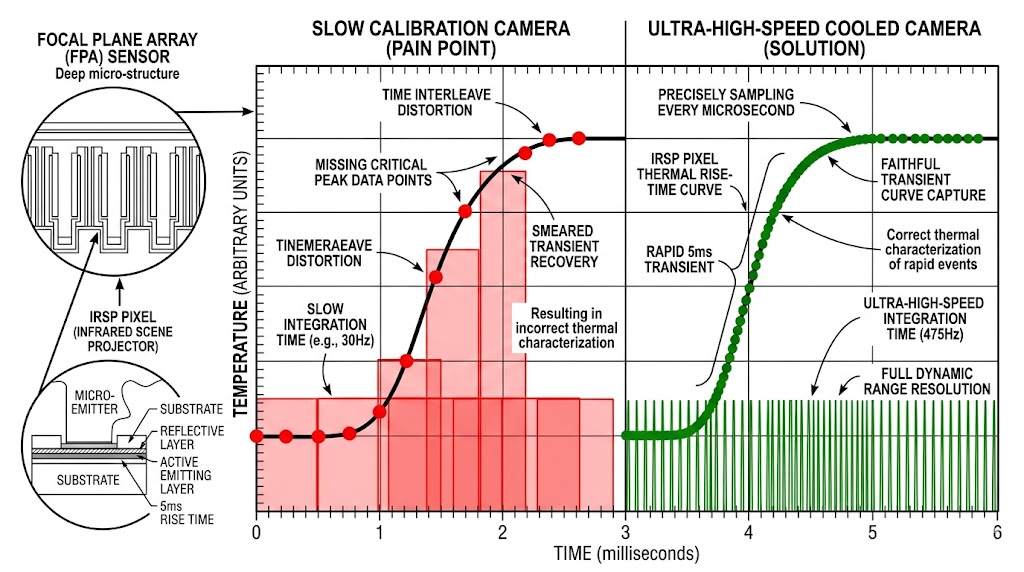 示意圖中呈現慢速相機(30Hz)積分長遺失 5ms 瞬態關鍵峰值,致熱特性化錯誤(左);超高速冷卻相機(475Hz)精確採樣,忠實捕捉曲線,實現正確特性化(右)。