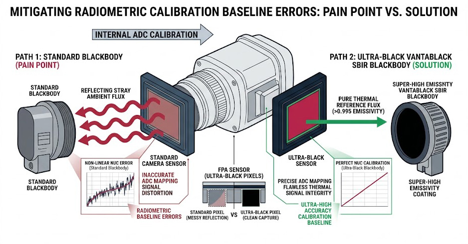 示意圖中對比絕對輻射校正:痛點為標準黑體反射雜散通量,造成非線性 NUC 誤差;解決方案利用超黑 Vantablack 黑體與超黑像素感測器,提供純淨熱參考,達成完美 NUC 校正與超高精度基準。