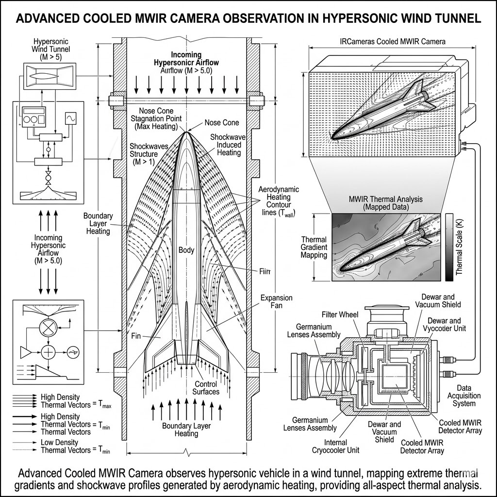 示意圖為先進中波紅外線攝影機於風洞內觀測高超音速載具,精準映射氣動力加熱產生的極端熱梯度與震波輪廓,提供無死角熱分析