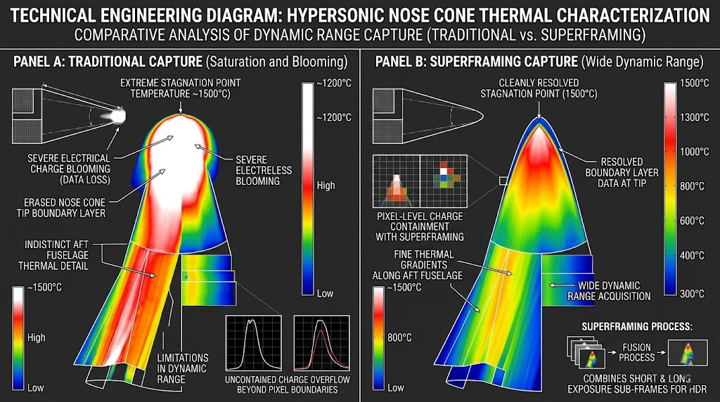 在風洞測試中,高超音速氣流衝擊載具鼻錐或前緣機翼(即駐點)的瞬間,局部溫度可能飆升至 1500°C 以上,而機身後段的尾跡區或冷卻結構卻相對處於低溫。若紅外線感測器採用固定的積分時間 (Integration time),為了觀測機身後段的微細溫差,鼻錐處的高能光子會瞬間充滿讀出電路的像素井容並向外溢出 (Blooming) 【業界共識】。這種嚴重的電子串擾會徹底掩蓋最關鍵的駐點熱梯度邊界,導致單一影格無法同時涵蓋整架模型的真實熱力學特徵。