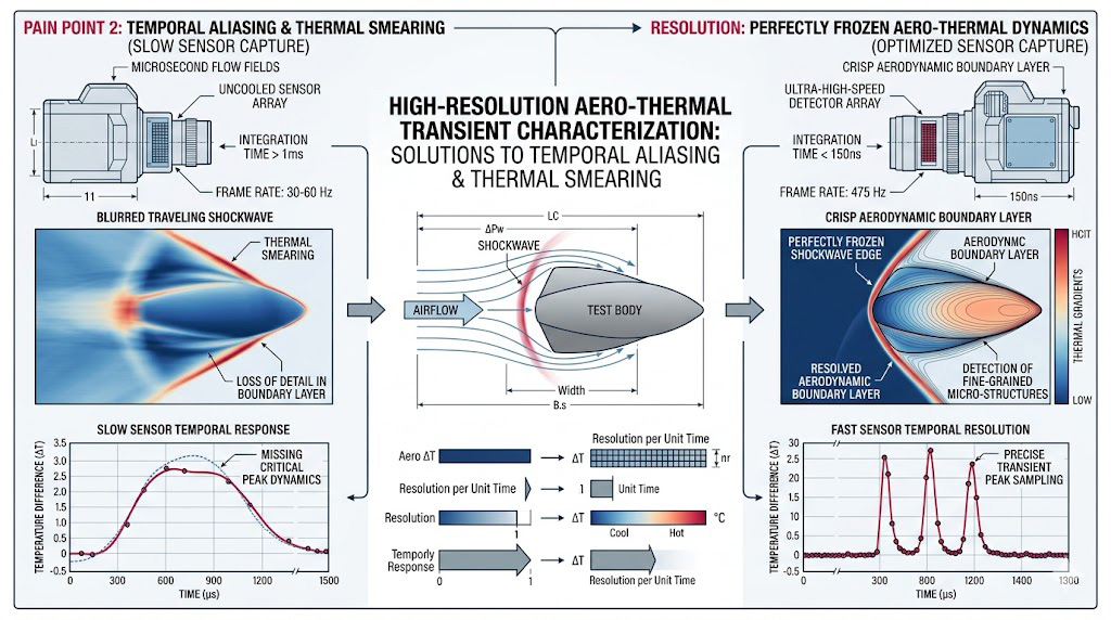 然而當量測團隊試圖在實驗室中擷取這些極端流體動力學的熱特徵時,往往會遭遇嚴峻的光電物理極限。有部分觀點認為使用標準的工業級非冷卻熱像儀,在設備建置成本與抗損壞風險上具備優勢;但在本文討論的「微秒級流體暫態」與「絕對輻射度精準對應」範疇內,常規設備的低幀率與動態範圍限制,會直接導致關鍵的熱梯度數據嚴重失真。為了確保風洞測試數據能精準回饋至高超音速熱力學模型中,光電量測人員在實務上必須克服以下三大工程壁壘。