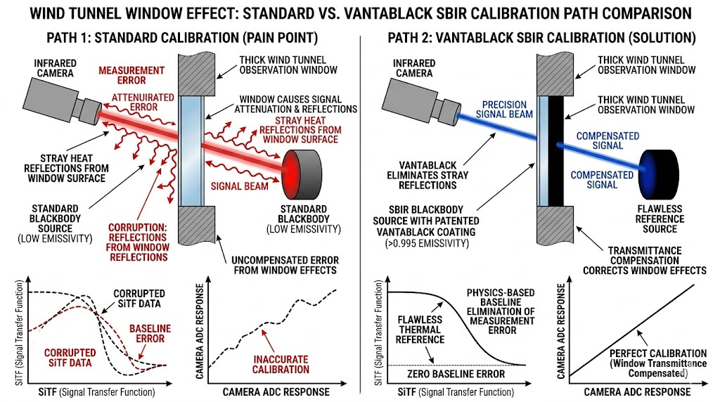 風洞厚重觀測窗會導致嚴重的訊號衰減與雜散反射,採用專利黑體進行穿透補償校正,可從物理根源消除量測基準誤差