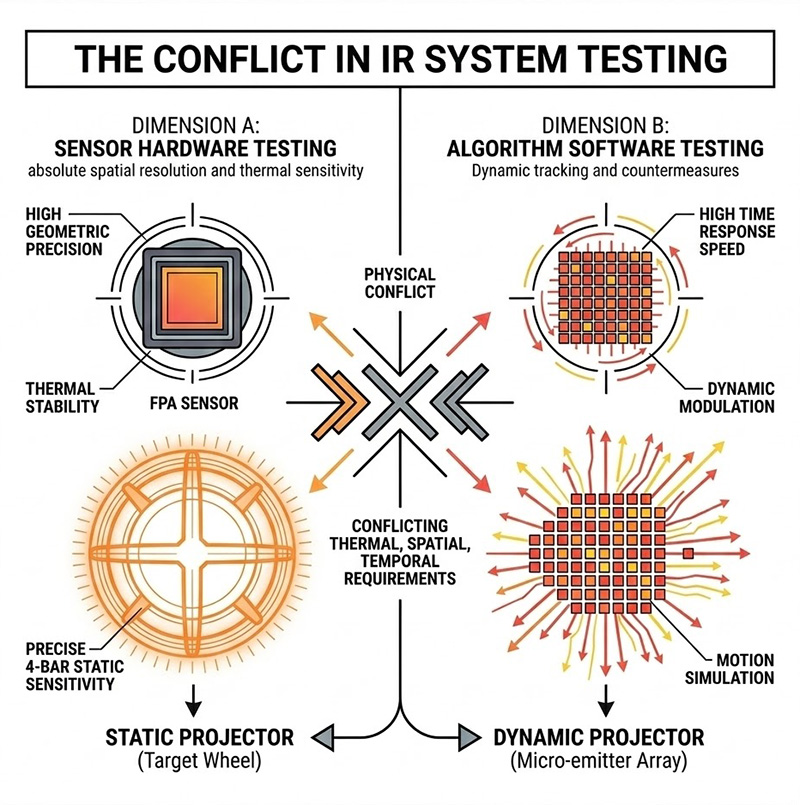 然而,紅外線系統的測試項目涵蓋了兩個截然不同的維度:一是評估感測器硬體本身的「絕對空間解析度與熱靈敏度」;二是評估後端影像處理電腦的「動態追蹤與反制演算法」,這兩個維度對輻射源的熱穩定性、空間幾何精度與時間響應速度有著完全衝突的物理要求,促使紅外線目標投影器分化為「靜態(Static)」與「動態(Dynamic)」兩種截然不同的熱力學與光電架構。