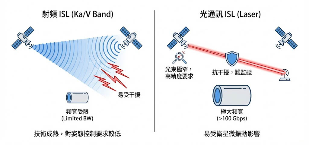技術成熟,對姿態控制要求較低,但頻寬受限且易受干擾。 - 光通訊 ISL (Laser):