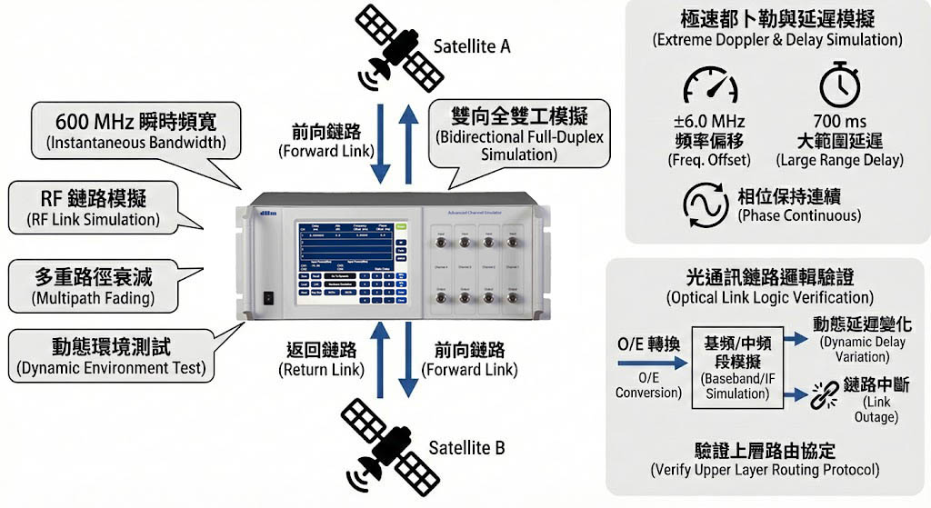 系統支援多通道配置,可以同時模擬衛星 A 到衛星 B(Forward Link)以及衛星 B 到衛星 A(Return Link)的雙向路徑。 - 極速都卜勒與延遲模擬: