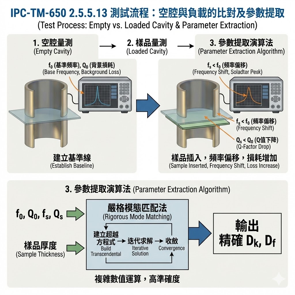 IPC-TM-650 2.5.5.13 的核心在於其複雜的數值運算,不同於簡單的微擾公式,此標準通常採用 嚴格模態匹配法 (Rigorous Mode Matching) 來求解,軟體會建立一個包含腔體尺寸、樣品厚度與待測 Dk/Df 的超越方程式,並透過迭代法收斂出精確解。這使得 SCR 即便在測試較厚樣品或高 Dk 材料時,仍能保持極高的準確度。