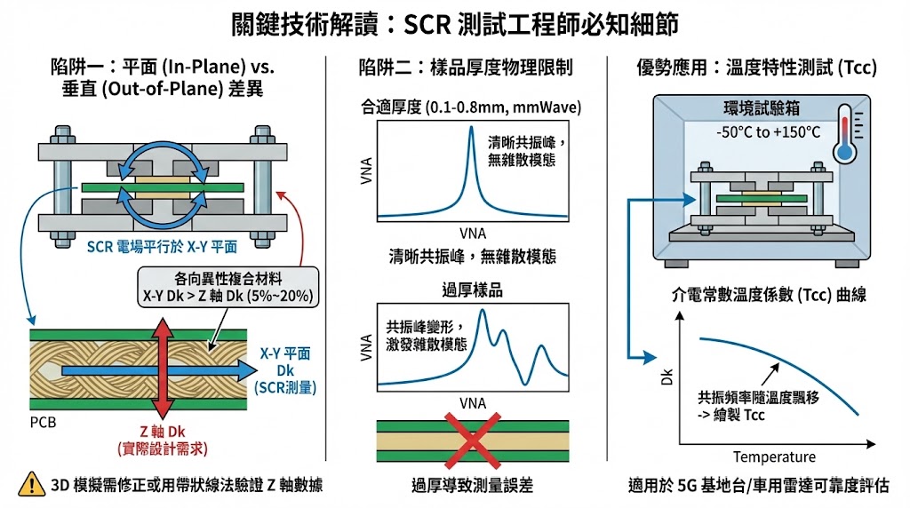 這是 SCR 測試中最常被誤解之處,由於 SCR 的電場是環繞樣品表面的(TE 模態),因此它測量的是材料在 X-Y 平面 的介電特性,然而 PCB 傳輸線或天線設計往往更關注垂直於板材方向 (Z 軸) 的特性,對於含有玻璃纖維編織的複合材料 (如 FR4, PTFE 織物基板),由於纖維結構導致的「各向異性 (Anisotropy)」,SCR 測得的平面 Dk 值通常會比 Z 軸 Dk 值高出 5% 至 20%;SCR 數據非常適合用於進料檢驗 (IQC) 與配方一致性監控,但在進行 3D 電磁模擬時,若直接套用 SCR 數據於 Z 軸參數,必須考慮修正係數或搭配帶狀線法 (IPC-TM-650 2.5.5.5) 進行驗證。