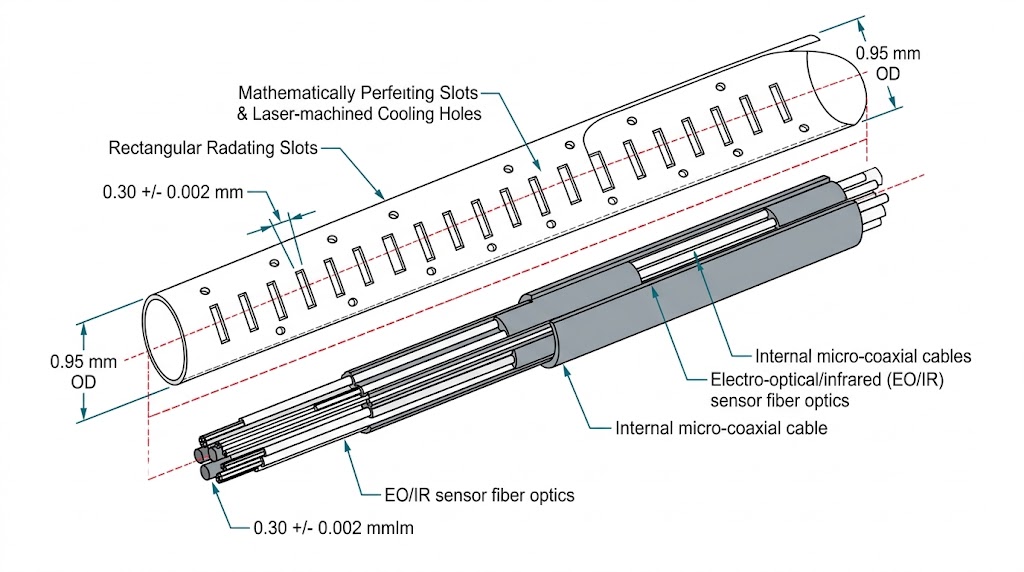 0.95mm直徑精密微型組件示意圖,整合了精確輻射槽與雷射冷卻孔,內部融合微同軸電纜與EO/IR傳感器光纖。