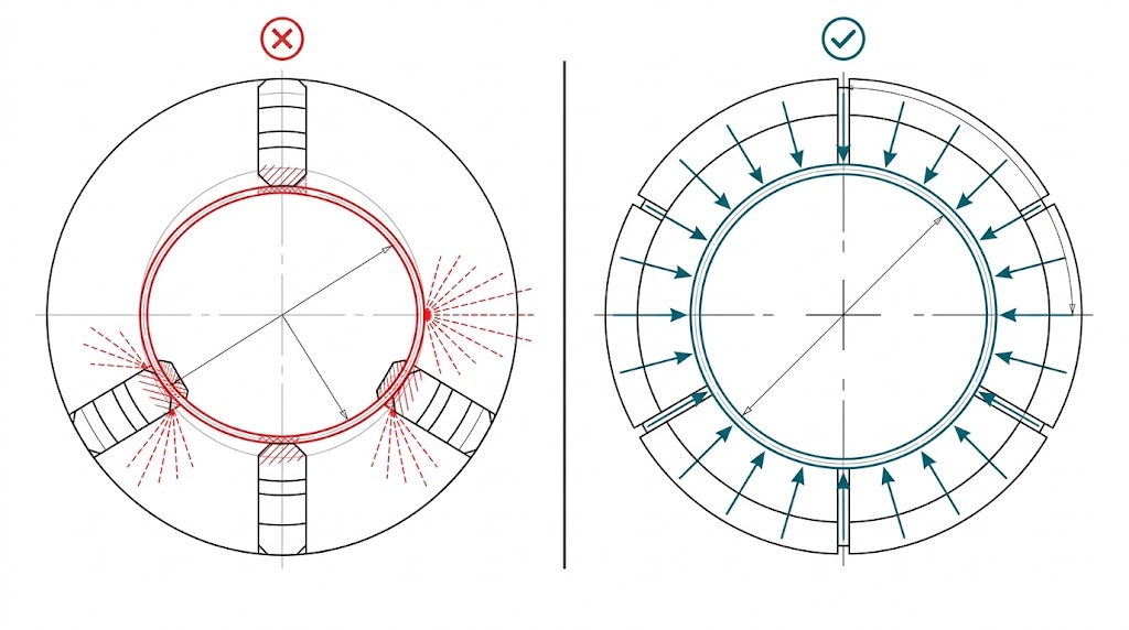 三爪與多瓣夾具夾持力分佈比較圖:左側三爪卡盤壓力集中(紅X),右側多瓣夾具壓力分佈均勻(藍V)。