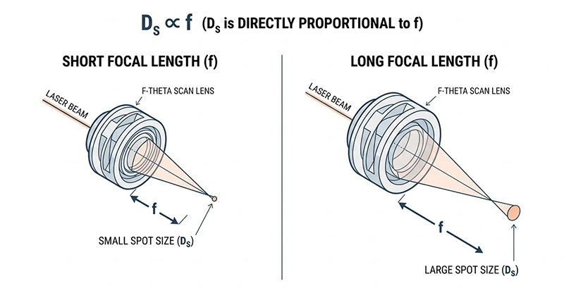 在雷射微細加工中,為了獲得極小的雷射焦點(Spot Size)以加工微米級的特徵,工程師必須使用短焦距、高數值孔徑(NA)的 F-theta 平場掃描透鏡,根據光學繞射極限的物理定律,雷射聚焦後的最小光斑直徑與透鏡的焦距成正比。