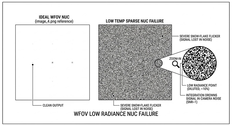 為了解決稀疏網格在低輻射區間的 SNR 崩潰,以及泛光法帶來的光暈假影,SBIR 的混合式 NUC 演算法採用了極具突破性的雙軌融合策略,系統首先在高輻射(高溫)區間使用稀疏網格法,精確定位並校正所有的極端離群值 (Outliers) 與盲元,建立一個高保真度的基礎校正矩陣,隨後在低輻射(近常溫)區間,系統無縫切換至泛光模式進行快速採樣,將數小時的低溫量測時間大幅壓縮至短短數分鐘內,從物理根源上避開了時域熱漂移的干擾。