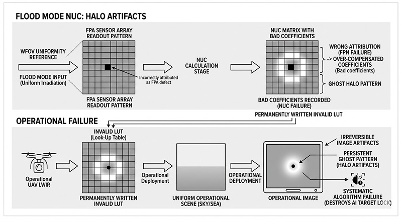 為了克服低輻射區間的 SNR 問題,工程師通常會轉向泛光法 (Flood NUC),一次點亮所有像素以獲取足夠的整體輻射能量,但泛光法的致命缺陷在於「缺乏空間解析力」,在緊密排列的大陣列中,相鄰像素的光學擴散點函數 (PSF) 會相互重疊,若陣列中存在物理損壞的「盲元 (Dead Pixels)」或極端暗像素,該區域的整體輻射量會呈現物理性的下陷;由於泛光演算法無法分辨這是單一盲元造成的,還是整個區域響應不足,它會直接計算出極高的增益補償係數,強加於該盲元周遭所有正常的像素上,結果導致在實際運作時,每一個盲元的周圍都會出現一圈異常明亮的「光暈假影 (Halo Artifacts)」,這對 AI 演算法的特徵辨識是毀滅性的干擾。