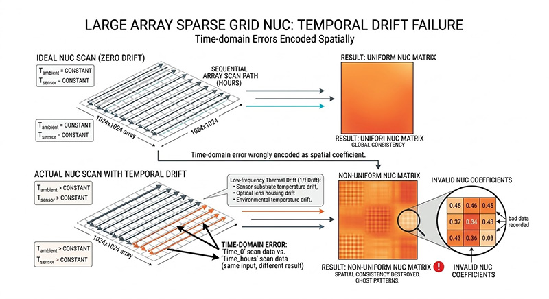 百萬畫素等級的陣列需要龐大的資料擷取次數。若完全依賴高精度的稀疏網格法掃描整個 1024x1024 陣列,並涵蓋高低溫的完整動態範圍,整個測試週期動輒耗費數小時甚至更長,在如此漫長的時間跨度內,測試相機內部的感測器基板、光學鏡頭的外殼,乃至於實驗室的環境溫度,都會產生低頻的熱漂移 (1/f Drift),這種時間維度上的物理漂移會直接耦合進入空間維度的輻射量測數據中,導致先掃描的陣列區域與數小時後掃描的區域,即使輸入相同的驅動電流,也會計算出截然不同的輻射基準。這種將時域誤差錯誤編碼為空間補償係數的現象,徹底摧毀了 NUC 校正的全局一致性。