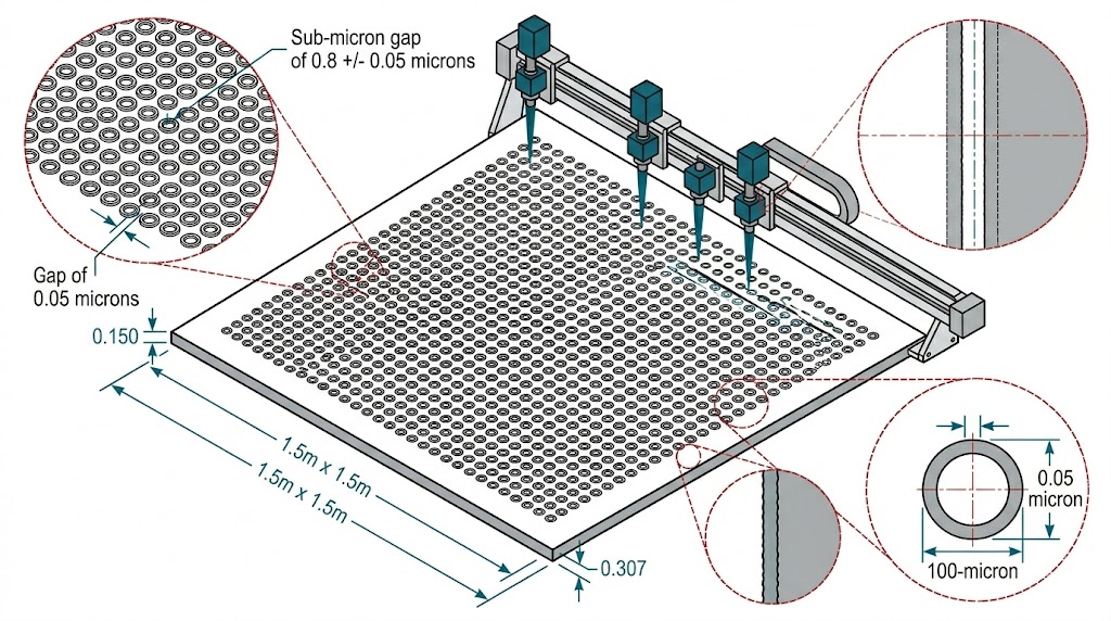 大型多頭加工圖,展示在 1.5 米 x 1.5 米面板上生成具有 0.05 微米亞微米間隙微結構的極致精密。