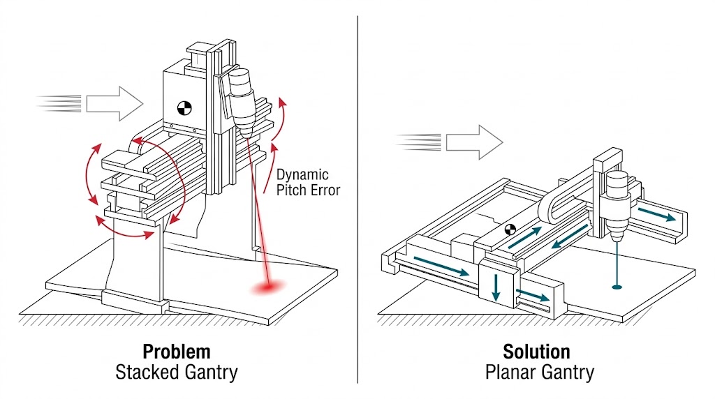 圖解比較堆疊龍門(左,高重心,動態俯仰誤差)與平面龍門(右,低重心,高精度穩定),藍色實心代表聚焦及穩定的解決方案。